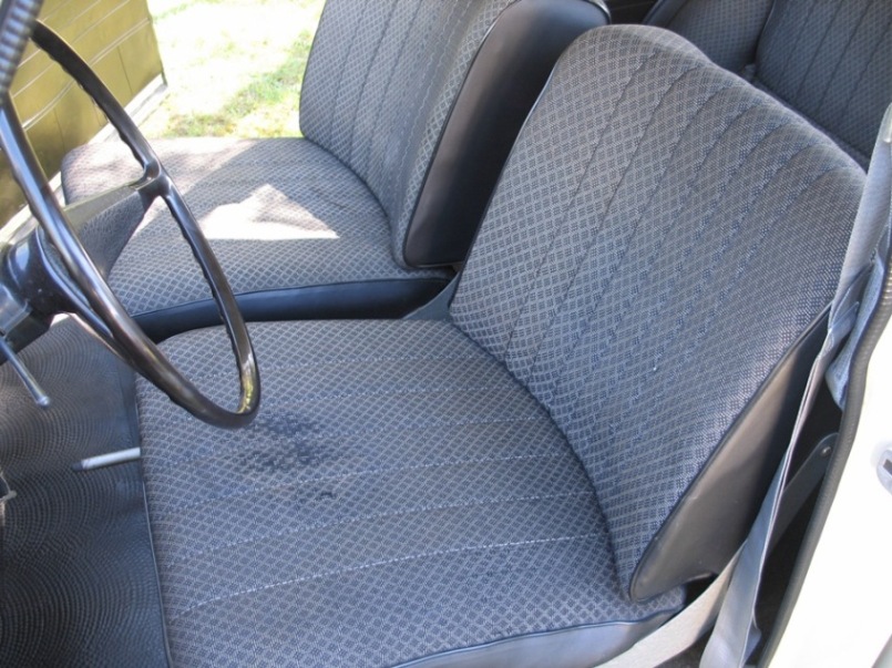 Die kompletten Sitze sind Rissfrei, auf dem Fahrersitz gibt es leider einen Fleck genau mittig im Sitzpolster! Hier ist über die lange Standzeit bei uns der Weichmacher aus dem Lenkrad ausgetreten und genau auf den Fahrersitz getropft.... trotz bester Reinigung ist es nicht mehr wegzubekommen- ärgerlich!! Lenkrad ist neu verbaut und natürlich kein Repro!!! |